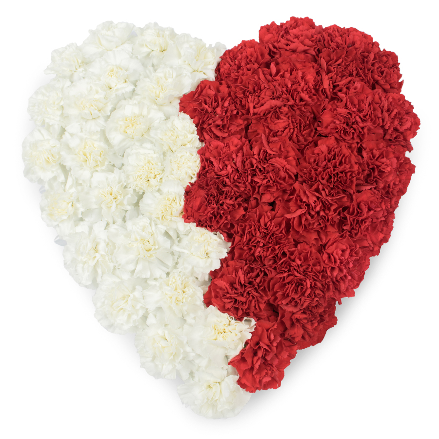 Our stunning heart-shaped bouquet combines rich white and red carnations, meticulously selected for their freshness and quality. This unique arrangement is perfect for conveying your deepest sympathies or heartfelt emotions with elegance.